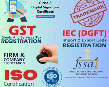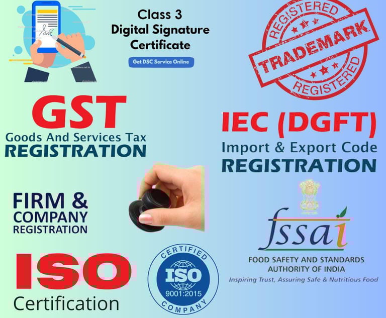 We are a professional CA firm providing end-to-end compliance and Business Registration Services. Our expertise includes Digital Signature Certificates, GST Registration & Returns, ISO Certification, Company/LLP incorporation, FSSAI licensing, RCMC Registration, ESIC/EPF registration and Taxation Support. We ensure accurate, timely and reliable solutions for your business needs.